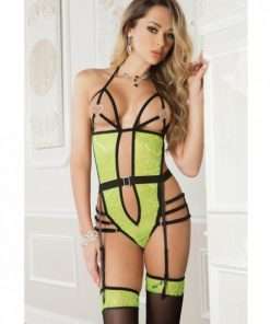Strappy Teddy Open Cups, Garter Belt & Stockings Green